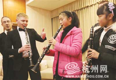 音乐会前,来自莫斯科的乐手给孩子们送上了漂亮的俄罗斯套娃做新年礼物;双方还进行了友好的“切磋”,教孩子们吹黑管的帅气乐手亚历山大,成了当日最具人气的明星。