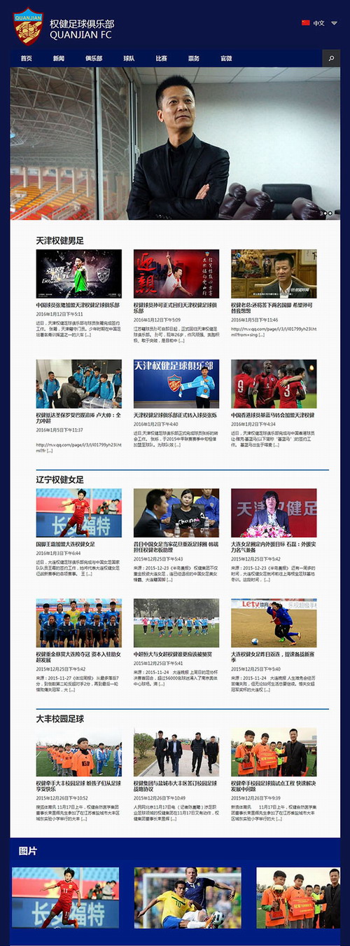 权健足球俱乐部官方网站页面选用深蓝色背景,简洁隆重,典雅大气。规划设计中、英、葡三国语言页面显示。栏目设置包含新闻、俱乐部、球队、比赛、票务、官微六大频道,从多角度全面报道天津权健足球队、辽宁权健女足队以及校园足球的相关即时新闻资讯。俱乐部频道下辖集团总部、管理层、队徽、主场、比赛服五大版块,详细介绍俱乐部及体育场相关情况。球队频道下辖一线队、预备队、女足、校园足球四大版块,详细介绍男女足及校园足球相关信息。