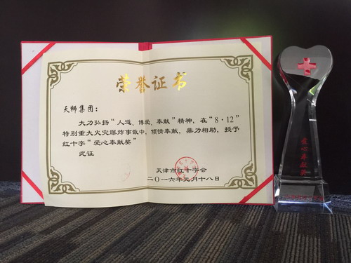 2016年1月18日,天津红十字会理事会召开,为2015年度为美丽天津建设展现新作为做出新贡献的爱心企业进行表彰。天狮集团因在“8-12”特别重大火灾爆炸事故中,大力弘扬“人道、博爱、奉献”精神,倾情奉献,鼎力相助,被天津红十字会授予“爱心奉献”奖。
