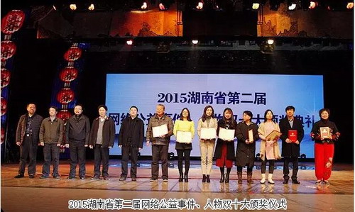 晚会现场还举行了2015湖南省第二届网络公益事件、人物双十大颁奖仪式。2015年,绿之韵集团携手湖南经视联合开展的《梦想照进现实》一对一帮扶活动,帮助了几十名贫困家庭的学子、老人,助力他们实现梦想,得到了社会的广泛好评。绿之韵集团《梦想照进现实》公益项目也因此获得2015湖南省第二届网络十大公益事件,绿之韵公益基金会秘书长蒋文上台领奖。