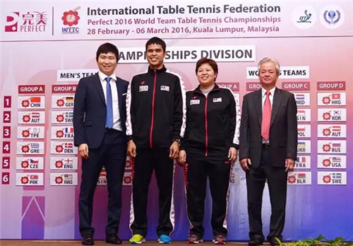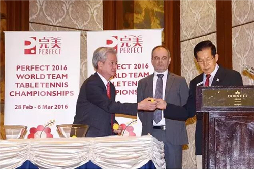 1月16日,2016年吉隆坡乒乓球团体世锦赛抽签仪式在马来西亚举行,完美公司董事长古润金作为马来西亚乒乓总会会长出席仪式,并为世乒赛进行抽签。