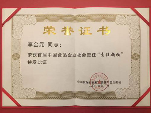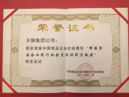 2016年1月22日,中国食品企业社会责任年会于北京钓鱼台国宾馆盛大召开,天狮集团以其多年来在食品安全、履行社会责任等领域所做出的表率作用赢得业界和组委会的肯定,获得“跨国食品企业践行社会责任特别贡献”奖,并入选首届“中国食品企业社会责任百强企业”,李金元董事长荣获“中国食品企业责任领袖奖”。