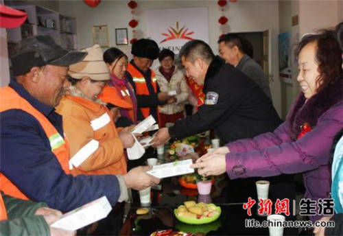现场为环卫工人发放小礼品