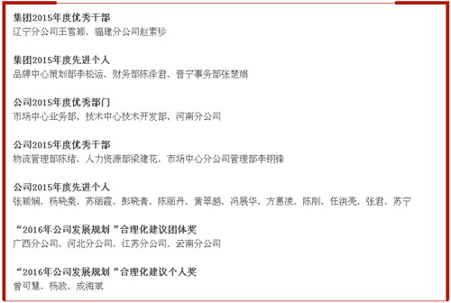 康美时代今天取得的成绩,与所有康美家人的共同努力与辛勤付出是密不可分的。在过去的一年中,公司涌现出了一批心系公司发展、爱岗敬业、热忱服务的优秀代表, 朱总、张总以及公司各位领导对先进团体和个人进行了表彰。让我们所有康美时代的家人,以他们为榜样,学习先进,提升自我,为康美时代的发展贡献自己最大的力量!