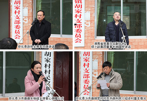 春节将至,乡音袅袅,聊叙家乡情;绿韵大爱,恩情悠悠,反哺桑梓心。2016年2月4日,安化县政协主席李太源,中共安化县委常委、政法委书记罗必胜,湖南省慈善总会副会长、绿之韵集团董事长胡国安,湖南省慈善总会办公室副主任刘谋益,湖南省志愿服务指导中心副主任蒋铁阳,安化县慈善总会办公室主任肖晟,中共安化县冷市镇党委书记周华山、镇长杨锋,绿之韵公益基金会秘书长蒋文及爱心志愿者代表等一行来到湖南省安化县冷市镇胡家村,为乡亲们送上慰问金、米、油和日用品等物资,为他们送去新春的祝福。湖南都市频道、红网、潇湘晨报、安化电视台等多家媒体对本次爱心慰问活动进行了报道。