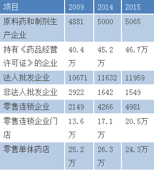 1,医药企业的数目仍在增加,虽然增幅比较缓慢,但是仍有增长,行业兼并仍有待加强,也从侧面说明了医药行业仍备受看好;2,药品生产经营企业数量大增,但是数量增加主要在于连锁药店数量的飞速增加,门店数从13.6万增加到20.5万,增加了近7万,基本上是生产经营企业的数量,单体药店的数量比2009年减少了近1万,和2014年的数据相比是减少了2万。
