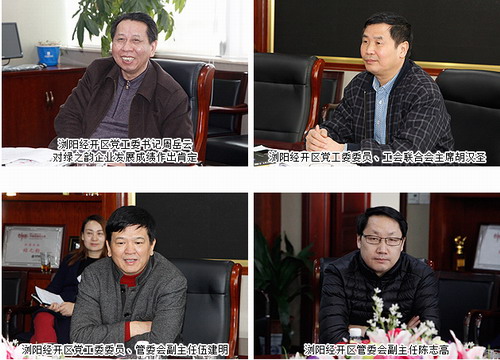 为了解企业工作进展情况、新年工作计划,深入开展党的群众路线教育实践活动,更好地为园区企业服务,2016年2月15日,大年初八,春节后的首个工作日,浏阳经济开发区党工委书记周岳云,浏阳经济开发区党工委委员、工会联合会主席胡汉圣,浏阳经济开发区管委会副主任陈志高等工委办、财政局、经贸局、科技局主要负责同志一行深入走访园区企业代表。本次走访以企业发展、党团建设、税收贡献等方面为载体,了解企业发展情况、存在的问题和困难,征集对园区党工委班子开展群众路线活动及加快园区经济社会发展的意见和建议。周岳云书记一行与企业负责人、员工拉家常,送上新年问候,并鼓励企业加强创新、开拓市场,实现跨越发展。绿之韵集团董事长胡国安、董事执行总裁劳嘉、党总支部书记许达仲等公司领导与员工代表陪同走访并参与座谈。