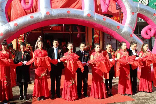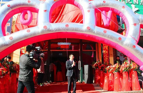 理想科技集团辽宁分公司经理贾钬钧与经销商代表为理想科技集团索菲缇丝(SOFTEAS)沈阳店开业剪彩
