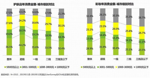 城市级别间人均美妆花费差距明显。城市级别越高,年花费越高;彩妆差距更甚,超级城市5000元以上占主流(35.9%),三线城市则大部分花费在1000元以下。