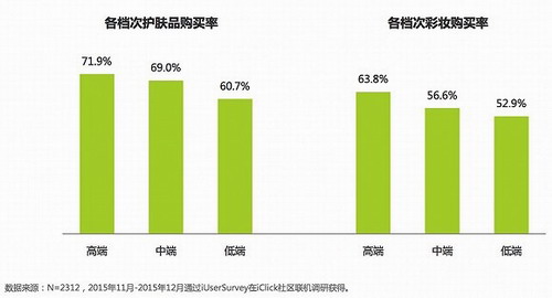 虽然在整体花费金额方面,护肤以中等消费金额为主,彩妆以中低端消费金额为主,但是在购买率方面,高端美妆产品购买率最高。