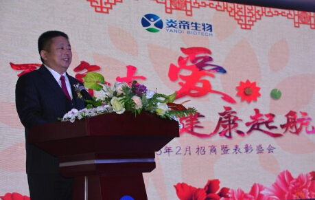 灵猴出世群情奋,伏蛰惊雷大地春。2016年2月20日,乘着新年的祥瑞之气,炎帝生物“百年大爱,健康起航”月度招商表彰盛会在总部隆重召开,炎帝生物董事长黄佳林、上海三湘副总裁厉农帆、炎帝董事CEO钟建和率领公司高层,炎帝生物各系统领导人率领市场精英出席了本次活动。