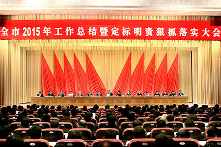 2月15日,烟台市2015年工作总结暨全市定标明责狠抓落实大会在烟台国际博览中心会议中心礼堂召开。烟台市委书记孟凡利出席会议并讲话,烟台市委副书记、市长张永霞主持会议,烟台市委副书记王继东宣读了市委、市政府《关于表彰2015年度“三考核两上榜”先进集体、先进个人的决定》。