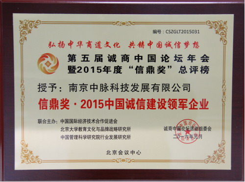 在刚刚结束的第五届“时代先锋·诚商中国”论坛上,中脉科技凭借多年来良好的企业信用和在消费者中优良的口碑,赢得了论坛组委会的肯定,被授予“信鼎奖·2015中国诚信建设领军企业”荣誉称号。