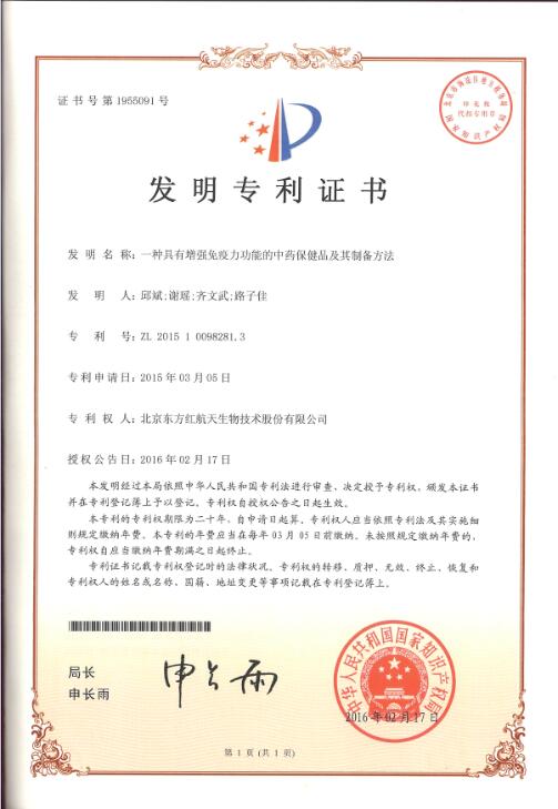 北京东方红航天生物技术股份有限公司(以下简称“公司”)于近日收到国家知识产权局颁发的“一种具有增强免疫力功能的中药保健品及其制备方法”发明专利证书。具体情况如下: