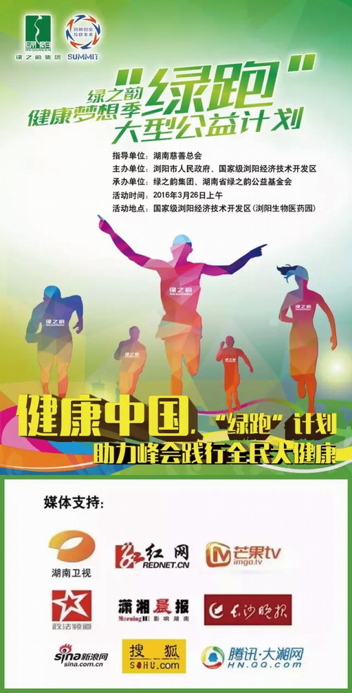 为积极响应并贯彻习近平总书记指示精神,倡导绿色健康生活方式,宣传全民健康的生活理念,由湖南省慈善总会指导、浏阳市人民政府、国家级浏阳经济技术开发区主办,绿之韵集团承办的《健康梦想季—绿跑公益计划》即将于2016年3月26日上午热力开跑。