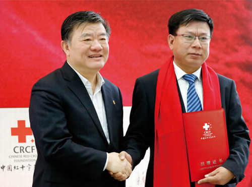 中国红十字基金会理事长郭长江(左)代表“院士博爱基金”,接受以岭药业总经理吴相君(右)捐赠款物1000万元。