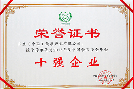 2011—2015年,三生连续5年荣获中国食品安全年会十强企业(证书)