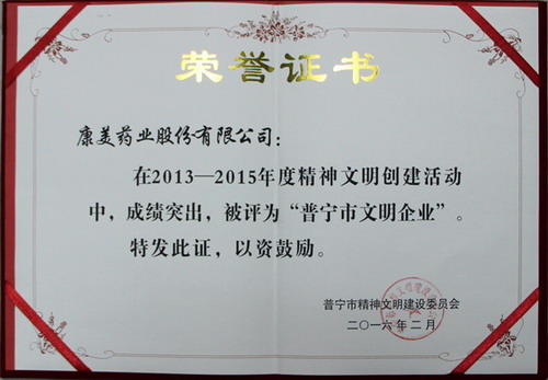 3月11日,“普宁市宣传工作暨精神文明建设”表彰大会在普宁市政府隆重召开,大会对普宁市2013-2015年度精神文明建设先进集体和先进个人进行表彰,康美药业再次荣获“普宁市文明企业”荣誉称号,公司自2006年至今连续五次获得该项荣誉。