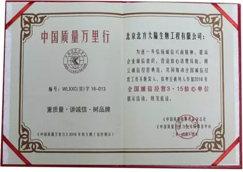 在2016年3.15消费者权益日来临之际,北京北方大陆生物工程有限公司以安全的产品品质、优质的用户服务和严格的风控标准,不仅得到了消费者的高度认可,也得到了有关公信部门的充分肯定,被授予“全国诚信经营3.15放心单位”。