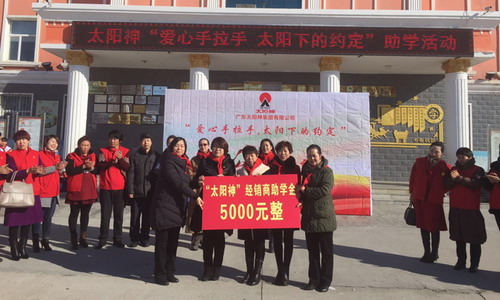3月11日,太阳神内蒙古分公司携手当地经销商伙伴在呼伦贝尔市海拉尔区正阳小学开展爱心手拉手“太阳下的约定”主题公益活动,为该校10名贫困学生捐赠5000元助学基金,大家齐心协力为孩子们送上一份爱心,亦托起了孩子们对生活的信心与希望。此次公益活动也受到了呼伦贝尔市当地媒体的密切关注,他们纷纷对此进行了跟踪报道并对太阳神的爱心义举表示了充分的肯定。