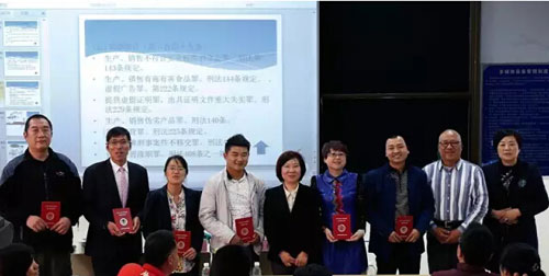 云南省食品安全协会副会长胡渝明(右二)、秘书长何敏(右五)、副秘书长杨万河(右一)为优秀学员颁发合格证书