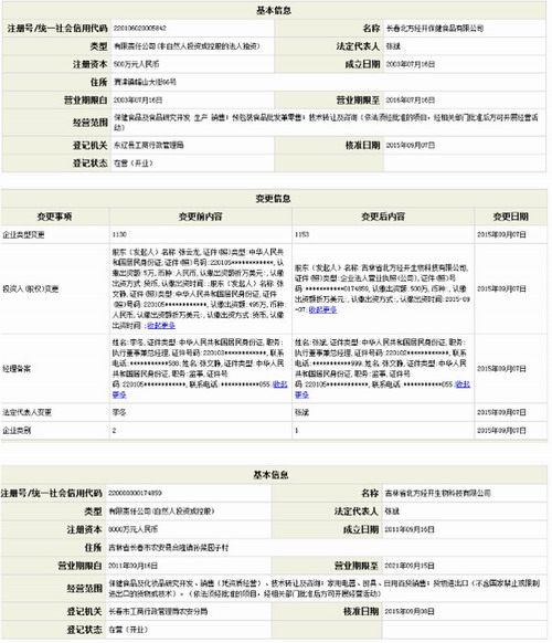 通过全国企业信用信息公示系统了解到,长春北方经开保健食品有限公司成立于2003年,主要从事保健品的生产和销售,注册金500万 ,法人:張斌。2011年,吉林省北方经开生物科技有限公司成立,注册金8000万,股东有:张斌,张文静,周玲。2015年9月,长春北方经开保健食品有限公司股权变更,由吉林省北方经开生物科技有限公司100%控股。主要经营范围:保健食品及化妆品研发,销售(凭资质经营)技术转让及咨询,家用电器,厨具,日用百货销售,货物进出口(不含国家禁止或限制进出口的货物或技术)。经营范围含括了直销产品的五大类。