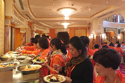 阿拉伯塔酒店因外形酷似船帆,又称迪拜帆船酒店,酒店建在离沙滩岸边280米远的波斯湾内的人工岛上,仅由一条弯曲的道路连结陆地,共有56层,321米高,使阿拉伯塔酒店也成为全世界最豪华的酒店,被称作波斯湾的明珠。尚赫包场酒店的27层,伴随着《阳光尚赫》的美妙旋律,家人们在这样一个富丽堂皇的高品质用餐环境中享受自助晚餐,体会真正的奢华与无与伦比的至尊感受。