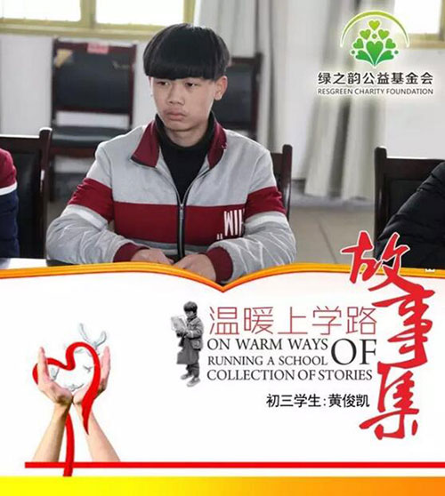 浏阳市小河乡小河初中初三学生。在黄俊凯初二的时候,疼爱他的奶奶去世了。现在他和爷爷相依为命,爷爷年纪大了,腿脚不好,几乎无法下地干活。没有一技之长的父母平时只能靠卖点苦力打点零散工挣点钱,家庭十分拮据。无法帮到更多,黄俊凯只能在家多帮着干活,扫地、洗碗、擦门,在点点滴滴的生活里给家里更多帮助和温暖。关于以后和将来,即将初中毕业的他却没有更多打算。多数时候,面对问题时他都习惯以“不知道”作答,然后一个人默默良久。
