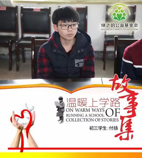 浏阳市小河乡小河初中初三学生。几年前,付扬的父亲去世,留下了他和妈妈、弟弟相依为命,生活全靠母亲打工支撑,家庭收入十分微薄。为了供两个儿子读书,付扬的母亲在当地的花炮厂打工。多年来的日夜操劳,让这个坚强的母亲也积劳成疾,体弱多病。面对未来,付扬说他只想一直陪着妈妈,好好照顾妈妈和弟弟。