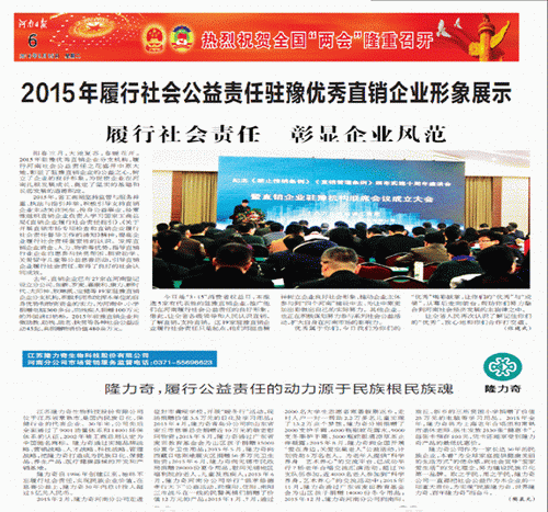2016年3月15日,河南日报专刊刊登了 “2015年履行社会公益责任驻豫优秀直销企业形象展示”。隆力奇凭借2015年对公益活动的积极参与及投入力度,获得河南日报的邀请,在河南日报“315消费者权益日”专刊刊登了隆力奇公司2015年的公益活动项目。