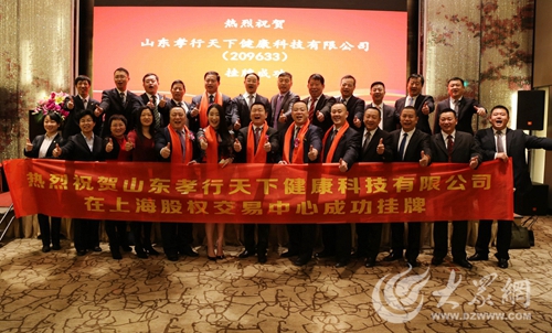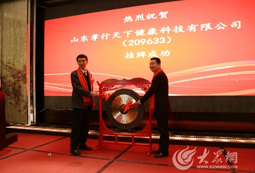 2016年3月25日上午9:30,随着一声响亮的铜锣声响,山东孝行天下健康科技有限公司(企业股票代码:209633)在上海股权托管交易中心成功挂牌上市,标志着该公司将进入新的发展轨道,实现跨越式腾飞。临沂市高新区管委会副主任吴宇、山东卫康生物集团董事长王宗继参加仪式并致辞。