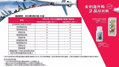 安利海外购自3月24日上线以来,得到了市场的热烈关注,目前纽崔莱两款产品的配售已启动两天,大家也开始逐渐熟悉海外购平台,并陆续向公司提供使用反馈,为公司总结海外购运营管理的经验、优化完善购物体验提供了很好的参考。感谢大家的理解和支持!