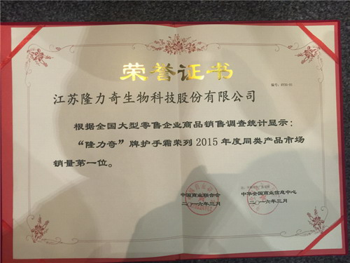 隆力奇护手霜荣列2015年度同类产品市场销量第一位