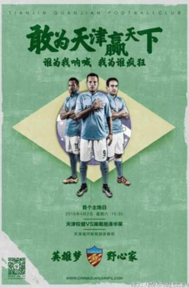4月1日,天津权健俱乐部发布了新一轮中甲联赛主题海报,名为:“敢为天津赢天下”。下面又加上了一则感人的标语:“谁为我呐喊,我为谁疯狂”。海报主角是权健队内的巴西三叉戟:法比亚诺、贾德森和格乌瓦尼奥。