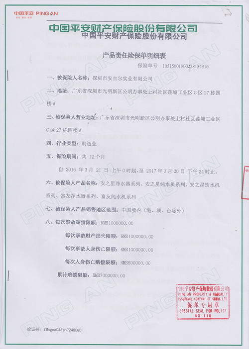 此次签署的保单项目协议为深圳市安吉尔实业有限公司旗下所有产品(涵盖安之星净水器系列、安之星纯水机系列、安之星饮水机等)进行全额投保,签订保单高达700万元的产品质量险及责任险,解决产品在使用过程中因其造成用户、消费者或公众的人身或财产损失,构筑消费者使用安全坚固防线。