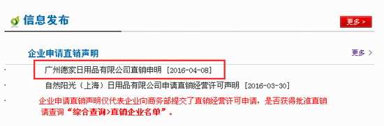 2016年4月8日,商务部直销行业管理信息系统网站发布广州德家日用品有限公司申请直销牌照信息。这是商务部2016年发布的第7家申牌企业。截止到目前,商务部申牌企业数量有32家。