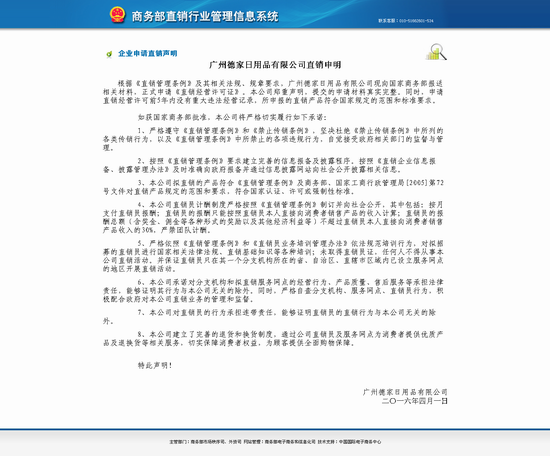商务部网站公示德家公司申请直销声明信息