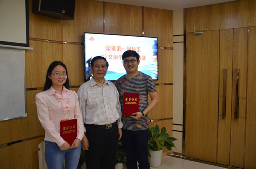 (路德扬董事长颁发荣誉证书以及代金券给获得三等奖的员工)