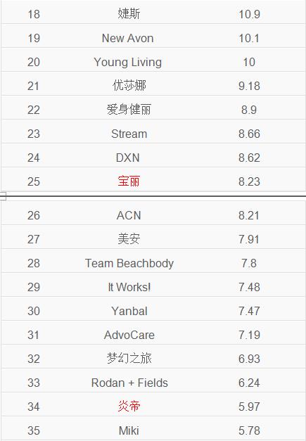 此次上榜的在华拿牌直销企业包括:安利、雅芳、康宝莱、福维克、无限极、玫琳凯、完美、如新、天狮、欧瑞莲、新时代、宝丽、炎帝、太阳神、罗麦、三生、康婷、美罗、安然、宝健、富迪、隆力奇、康美、金士力佳友、安惠、金日、理想、金木、天福天美仕。其中还包括已发布直销申请声明的外资企业自然阳光。