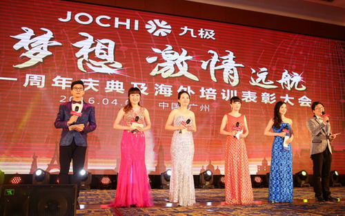 4月9日,夯行梦想 激情远航,九极三网合一周年庆典及海外培训表彰大会在广州五星级酒店东方宾馆盛大举行,现场星光闪耀,万众瞩目,广东九极生物科技有限公司领导:总裁宁水生,总裁助理侯瑞霞,全国营销总监顾伟奇,数据信息中心及人事总监杨哲,云集事业部总监李雄,教育培训中心经理许迪青,客户服务中心经理黄静儿盛装出席。