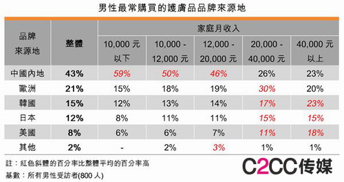 若以护肤产品价格作为区别,家庭月收入在20,000元以下的受访者购买爽肤水和面霜的平均价格分别约171元和166元;家庭月收入在20,000元以上的受访者,购买爽肤水和面霜的平均价格则分别约334元和339元。