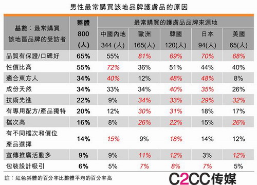 整体上,男性消费者购买护肤品的4个主要因素有:品质有保证/口碑好(65%)、性价比高(55%)、适合东方人(34%)及成份天然(34%)。
