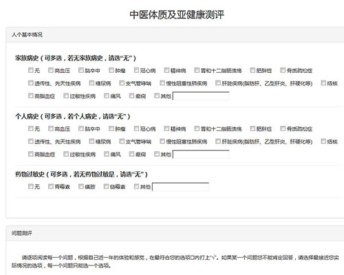 支付成功后,进入问卷填写页,进行体质辨识问卷填写: