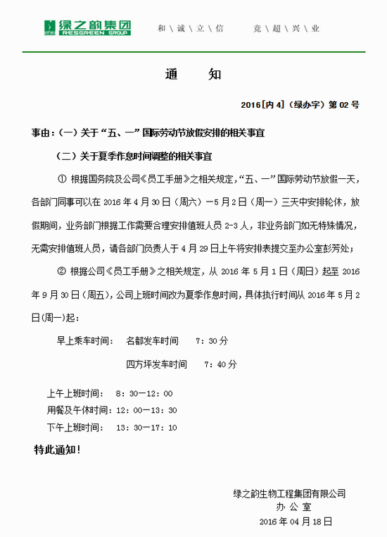 绿之韵发劳动节放假及夏季作息时间调整通知