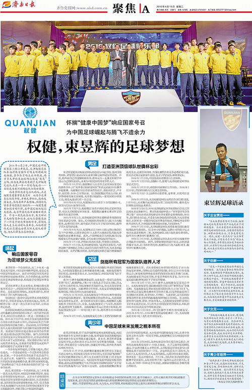 2016年4月19日,《济南日报》整版刊发了题为《怀揣“健康中国梦”响应国家号召 为中国足球崛起与腾飞不遗余力 权健,束昱辉的足球梦想》的专题报道。