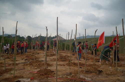 (黑沉沉的天,暴雨将至,依然挡不住家人们植树的热情)