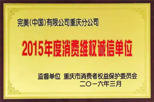 为了加强对商品和服务的社会监督,促进企业自觉履行社会责任,不断推进企业诚信守法经营,营造安全放心的消费环境,重庆市消费者权益保护委员会授予完美重庆分公司等企业“2015年度消费维权诚信单位”称号。