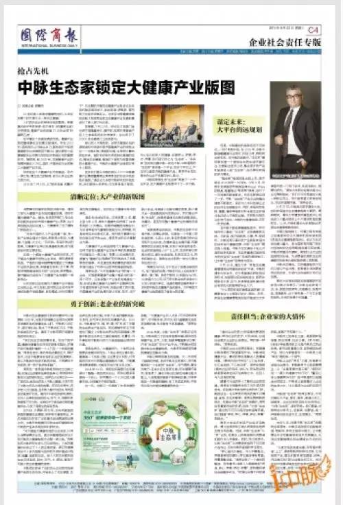 9月23日,由商务部主管的《国际商报》以题为“抢占先机——中脉生态家锁定大健康产业版图”整版报道了中脉。