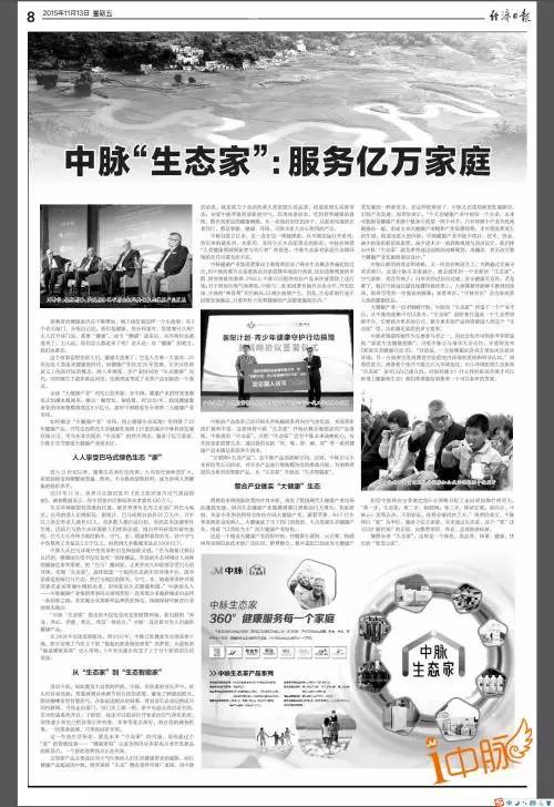 11月13日,由国务院主办的中央直属党报《经济日报》以题为“中脉“生态家”:服务亿万家庭”整版报道中脉。