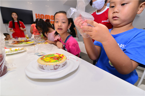 在地球庆生会环节,小朋友在志愿者的带领下,认真地搅拌面粉、鸡蛋、烘烤蛋糕……小朋友发挥想象,自己动手。将自己心中想对地球说的话和脑海最美的地球,美美地涂在蛋糕上。小朋友们围拢在蛋糕周围,大声地说出了最童真的祝愿“生日快乐”!